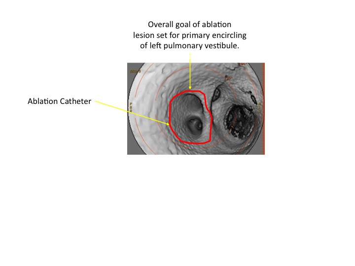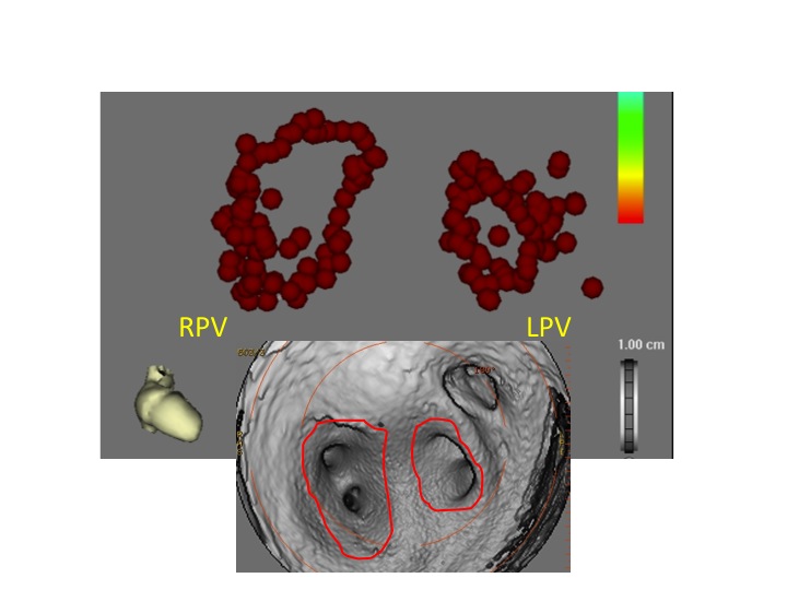 The final ablation lesion set is shown below with approximate primary line trajectories shown on the comparative CT scan of the right (RPV) and left (LPV) pulmonary venous antra.